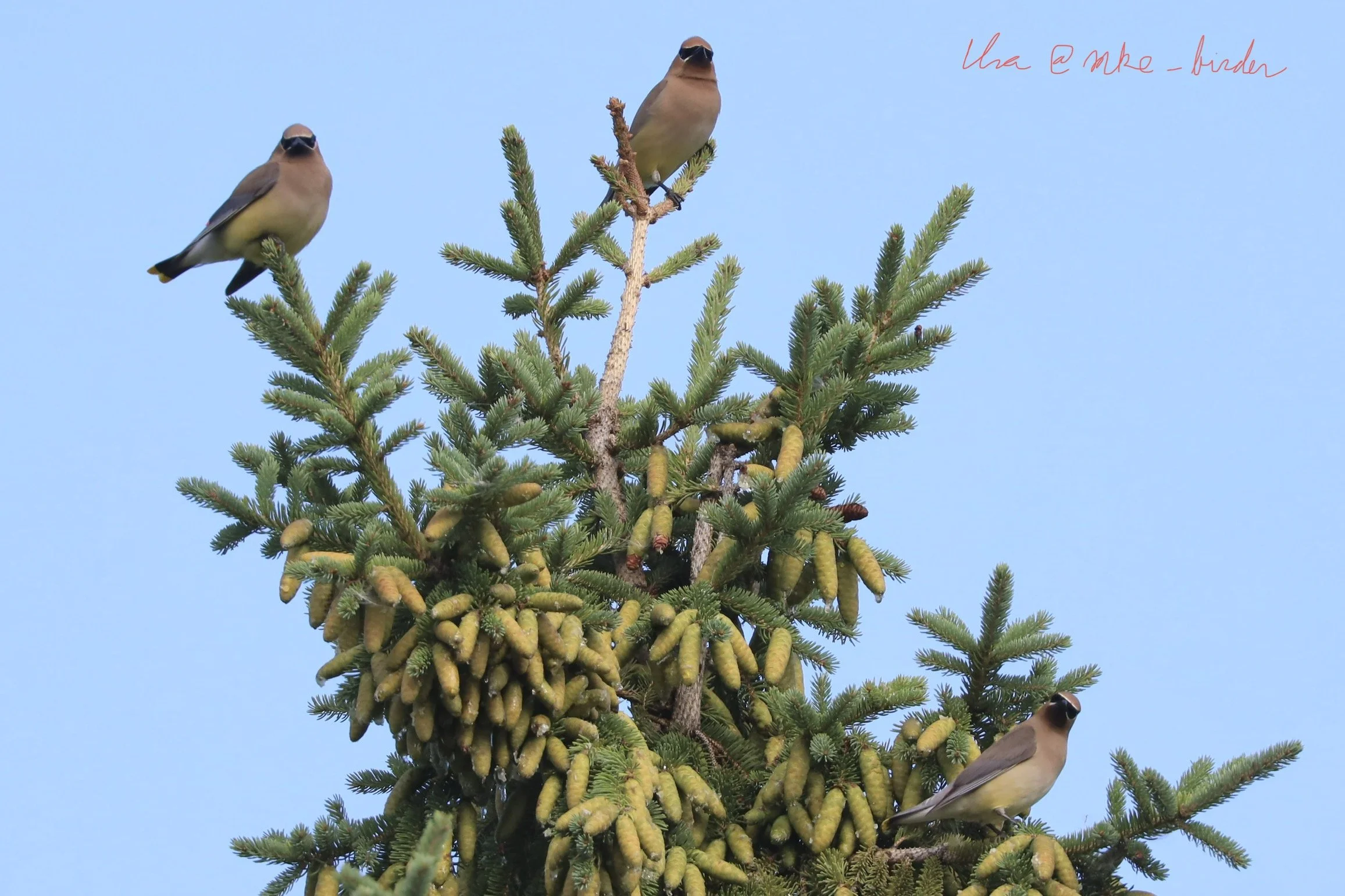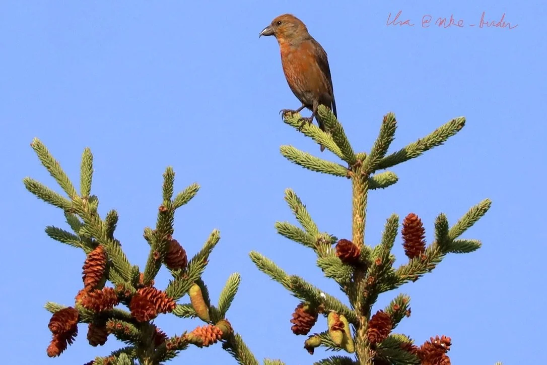 For a mere few seconds, we watched these crossbills take a quick meal from the cones before departing for other trees in the preserve.