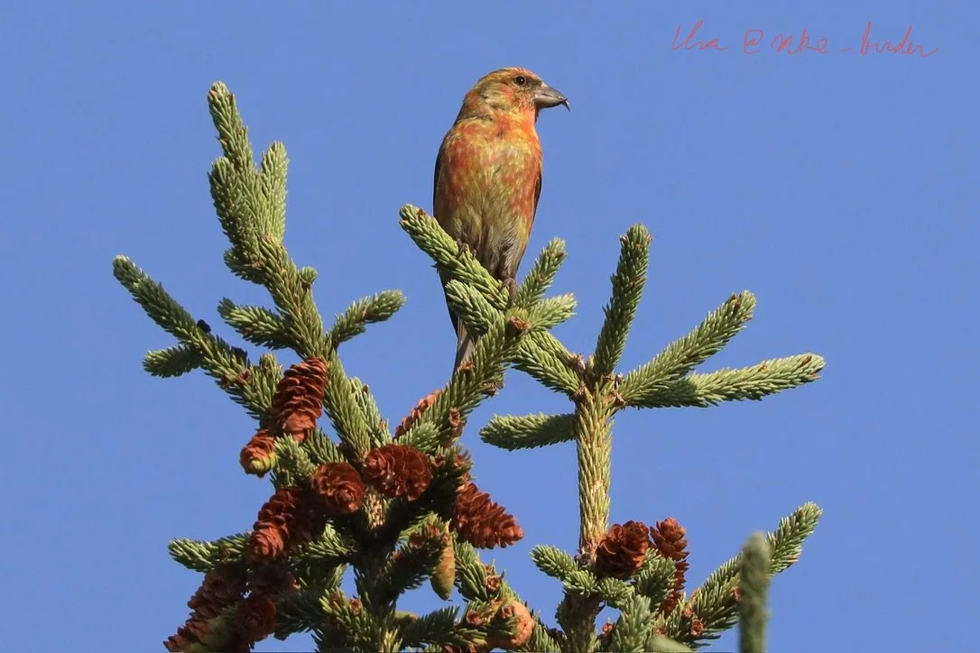Almost on cue, a flock of Red Crossbills alighted on a tree in front of us!